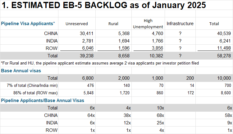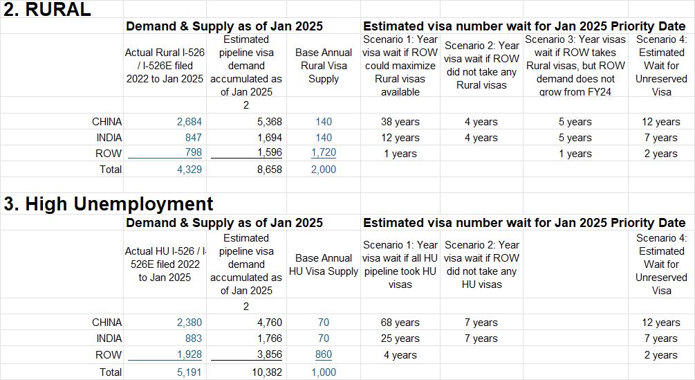 Table 1 summarizes the estimated EB-5 backlog as of January 2025. This includes legacy EB-5 applicants who started the process before RIA passed in March 15, 2022, and now still waiting for Unreserved visas. And the backlog includes nearly all EB-5 applicants with priority dates since March 2022, because Rural and High Unemployment visa issuance is just now finally getting started as of FY2025.