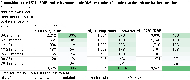 Wonderful news to report: USCIS finally published more quarterly data (for April to June 2025) and preemptively included two new reports with I-526/I-526E receipt detail by country and TEA category! Maybe someone at USCIS wisely thought: we don’t want to see Galati Law’s name one more time — let’s just give the people what they want instead of getting sued. Thanks to AIIA and IIUSA for all the hard work on FOIA requests that helped push this good result of improved data transparency, and to USCIS for listening. You can visit the USCIS Immigration and Citizenship Data page to access the new reports (and appreciate how much work goes into processing the raw data into the kind of analysis you find here). I’m in process of updating my spreadsheets. I will note a couple headlines: over 1,000 I-526E were approved in Q3 (4x more than the previous quarter), meaning that the pool of qualified Rural and High Unemployment visa applicants is very likely large enough by now to trigger Visa Bulletin cut-off dates, if only Department of State can catch up with interview scheduling and visa issuance. And Q3 had another bumper crop of I-526/I-526E receipts, with over 1,700 more investors added to EB-5’s economic benefit and ballooning backlogs. Important knowledge to have!