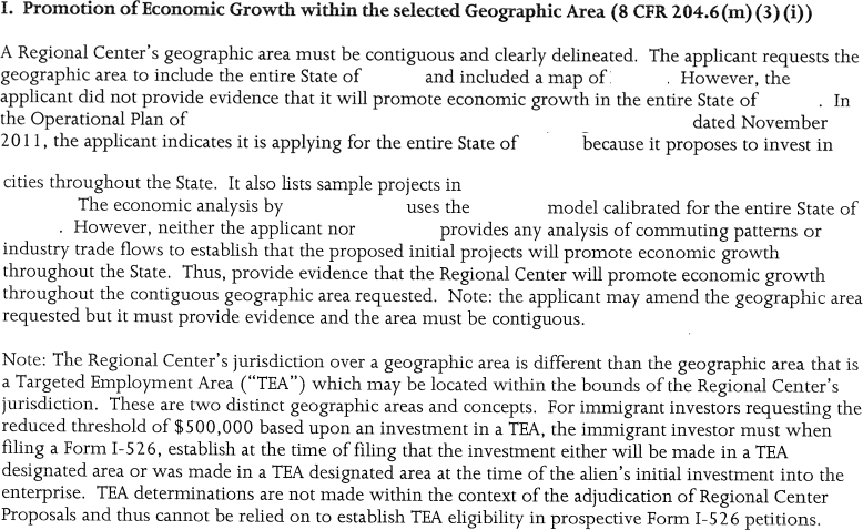 Now I’m seeing RFEs that not only suggest but seem to require that Regional Centers must initially request only the geographic area that’s in keeping with the economic impacts of their existing projects. For example, see this text from a recent RC application RFE: