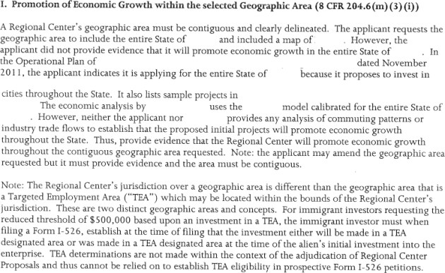 2012 Update: I-924 RFEs have become more insistent on the issue of justifying geographic area. See for example this section of an RFE issued in July 2012: