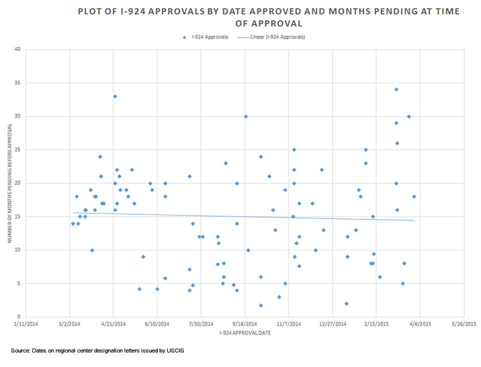 The numbers from designation letters suggest that I-924 amendments in 2014/early 2015 were processed much more quickly and predictably than initial designation requests (although USCIS has said there’s no separate workflow or special treatment for amendments), and that actual processing times have often far exceeded what one would expect from reported averages. The trend from 2014 into 2015 looks somewhat positive. A scatterplot of approvals shows an increasing number of approvals coming in under 10 months (but also that USCIS was still working on applications that had been in the pipeline for 2-3 years). I will be interested to see how the numbers change when I have more letters to add to the data set. USCIS designated 208 new regional centers in FY2015, and there were 902 Form I-924 applications pending at USCIS as of January 2016 (as reported by Mr. Colucci in statements on 2/2 and 2/3). I guess that many of the pipeline I-924s are amendments/Exemplar I-526 filed in mid-2015 ahead of anticipated program changes, not new RC applications, but still 902 is a big number. Regional center applicants filing Form I-924 today should not be too alarmed by the processing time outliers in 2014/2015 (many of those 2-3 year cases were caught up and delayed in the confusion over tenant occupancy, which has been cleared now), but they also shouldn’t count on finishing the process in nine months, considering the backlog and IPO’s past performance.