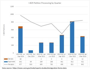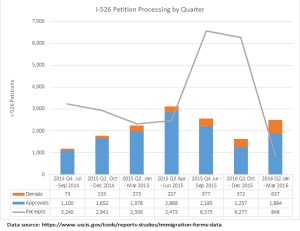 The Immigration and Citizenship Data page on the USCIS website has been updated with official numbers for I-526 and I-829 processing from January to March 2016 (FY2016 Q2). Extraordinarily low I-526 receipt numbers in Q2 balance abnormally high numbers in the previous two quarters. I-829 receipts are back on a normal trajectory after that odd dip in Q4 last year. The number of I-526 petitions processed in Q2 went up while the volume of I-829 processing fell proportionally. The previous quarter shows the same trend in reverse, suggesting that IPO has been allocating resources back and forth between I-526 and I-829. Besides the receipt trend, which is important but old news now, I note the number of I-526 denials. One fourth of the I-526 cases processed last quarter were denied — the most denials we’ve seen since 2013. Meanwhile, the petition backlog was dented but remains daunting.