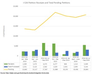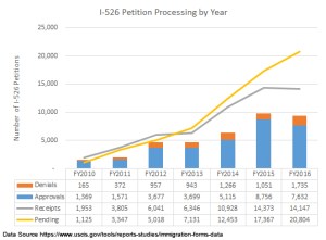 • I-526 Receipts and Backlog: The last quarter of 2016 saw another unnatural surge of I-526 filings (thanks for nothing, Congress), further swelling the already huge pool of pending petitions.  If USCIS continues to process about 9,500 I-526s a year (average for 2015/2016), then the 20,805 petitions currently pending will take over two years to process.