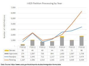 • I-526 Processing Volume: USCIS sped up considerably in the 4th quarter, processing more I-526 petitions than in prior quarters. 4th quarter decisions were also relatively positive – 91% approvals. However, the 4th quarter was not enough to improve the annual numbers. USCIS still processed fewer and denied more I-526 petitions overall in FY2016 than FY2015.