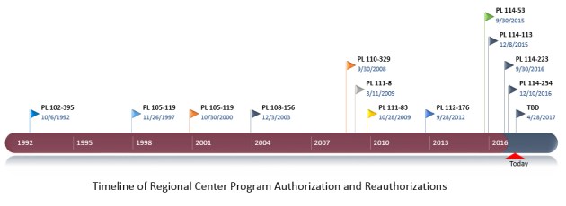 - 4/28/2017: H.J.Res. 99 – Joint Resolution making further continuing appropriations for fiscal year 2017, and for other purposes has been passed and signed into law, extending government funding and other provisions of Public Law 114–223 (including the regional center program) to May 5, 2017.