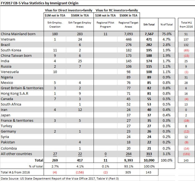 The US Department of State has published Table V Part 3 of the Report of the Visa Office 2017, which gives a tally of visas issued by country for the Employment Fifth preference (EB-5) in FY2017. If we believe USCIS processing times reports, these should be visas based on investments/petitions from 2015 or earlier. A few points to note: