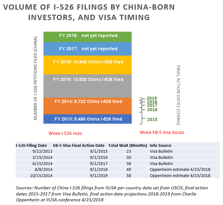 • In the Q&A period, Mr. Oppenheim reportedly projected these EB-5 visa wait times: China 15 years, Vietnam 6 years, India 5 years, Brazil and South Korea 2 years. [This time indicates years from today to conditional permanent residence for people filing I-526 today. But these estimates are subject to change depending on future demand trends.]