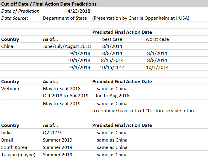 [10/30/2018 UPDATE: for more recent data and predictions, see my post AILA/IIUSA Forum Updates (Kendall, Oppenheim, visa availability)]