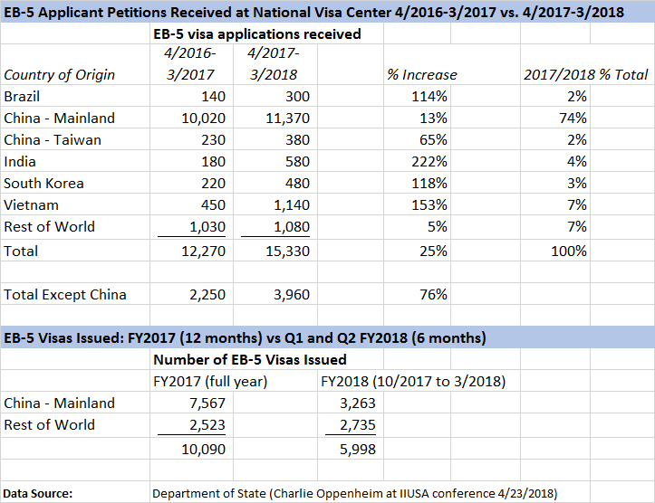 • USCIS has picked up the pace on I-526 adjudication. The National Visa Center received 25% more EB-5 applicant petitions in 2017/2018 than 2016/2017. That reflects I-526 processing improvement (good news), and results in more people ready to claim available visas (bad news for the visa backlog).
