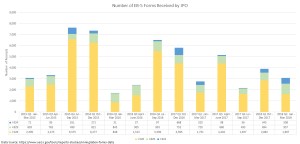 • Form receipts at IPO reflect a gradual downward trend, driven by falling I-526 receipts. However I-526 receipts remain unsustainably high. The 10,000 annual quota of EB-5 visas means that the program can accommodate about 830 I-526 per quarter on average (assuming about 3 visas per investor). FY18 Q2’s unusually low 1,607 I-526 receipts is still almost twice the sustainable average: one quarter’s filings sufficient to claim half a year of visas.