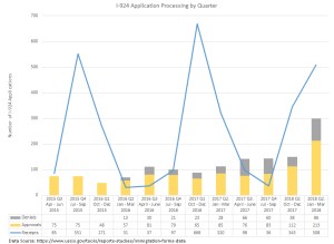 • Form I-924 receipts and processing were both significantly elevated in FY18 Q2. No wonder I-924 processing times look better than expected. I-924 denial rates remain high.