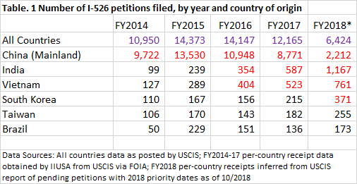 • In the slide I saw, the 49,527 number for China specifically represented China-born applicants at NVC plus estimated applicants associated with I-485 on file at USCIS. I wasn’t in the room to hear commentary, but the slide doesn’t say that the number represents the total Chinese wait line. At least the slide doesn’t include these groups: Chinese with I-526 still pending, and Chinese with I-526 approval but not able to file I-485 yet because visa numbers aren’t available. I don’t know how the NVC process works, so not sure whether there’s another group of people with I-526 approval but not yet qualified to be counted as NVC applicants. [Edit: I realize that this comment was incorrect — the slide likely does intend to represent the total wait line. But I have requested clarification from IIUSA — see the email copied in comments below.]