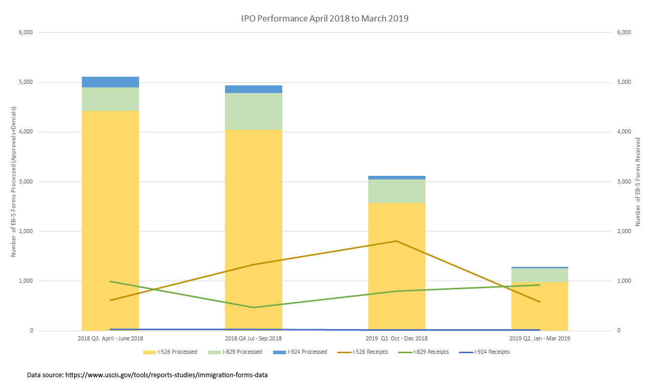 Nevermind the 25-40-month range for I-829 in the current USCIS processing times report; the average I-829 filed on top of the backlog in January 2019 would take 93 months to process if FY19 Q2 volumes continue. But surely this exponential output reduction must be an unnatural aberration and cannot continue indefinitely! In all its history, IPO has never shown such meager performance across the board as in the last two quarters. Meanwhile, note that receipts remain low.