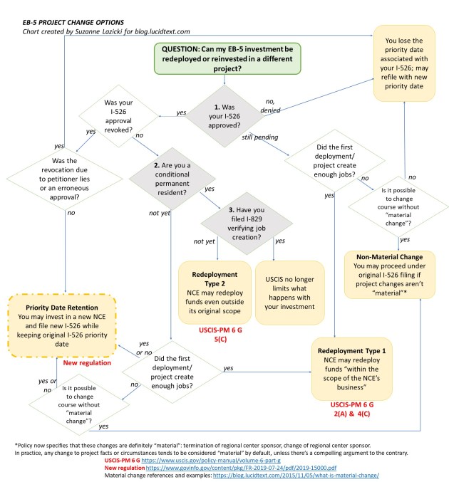 Considering that redeployment (as described in the USCIS Policy Manual) and priority date retention (as described in the final rule) are a maze of if-then statements, I’ve attempted a picture worth a thousand words. The flow chart image highlights several points that are often forgotten in discussions about redeployment: the existence of different redeployment options/requirements at different stages, and the pivotal questions of material change and whether or not the initial deployment already met the job creation requirement. (This chart matches my careful reading of the Policy Manual. But lawyers please email me with references if you see anything that does not match your reading, and I may update the image.)