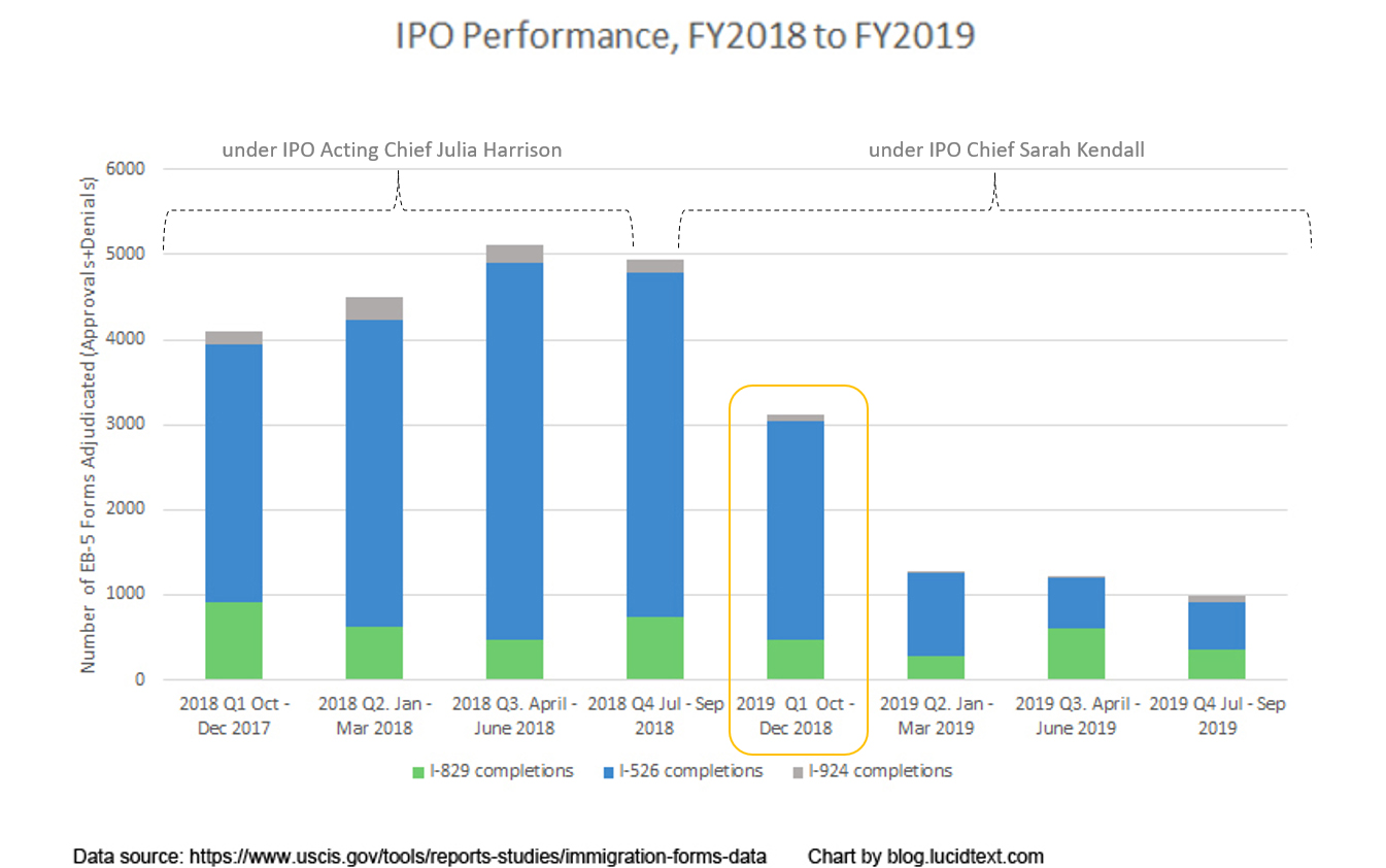 • The average I-526 approved in FY2019 Q1 had been pending 17.5 months, while the average approved I-829 had been pending 26 months.