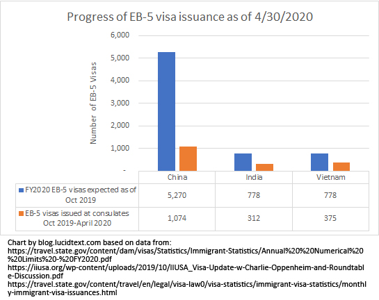 In October 2019, Department of State announced that it had 11,112 EB-5 visas available for FY2020, of which India and Vietnam could expect 778 visas each, and an estimated 5,270 could be leftover for China. DOS normally issues available visas gradually over the course of the year, about a quarter per quarter. But the actual pace of visa issuance has been slow with consulate closures, according to monthly reports of visas issued abroad.