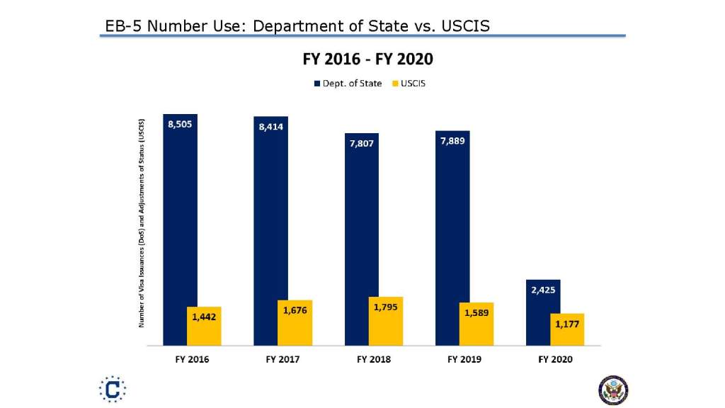 Per Oppenheim’s presentation, only 1,117 EB-5 visas were issued in FY2020 through adjustment of status – even fewer than in a normal year. (According to Annual Reports of the Visa Office 1,589 EB-5 visas were issued through adjustment of status in 2019, and 1,289 in 2018.) Adjustment of status in FY2020 was not limited by the EB-5 visa quota (since only 32% of available EB-5 visas were actually issued in the year), or by low demand (Oppenheim mentioned there are about 2,500 I-485 pending at USCIS for China-born applicants).  Therefore, I guess there must have been a choice to not move the visa bulletin in FY2020 in a way that would let AOS applicants advance ahead of consular processing applicants. Alternatively, USCIS slowness blocked the path.