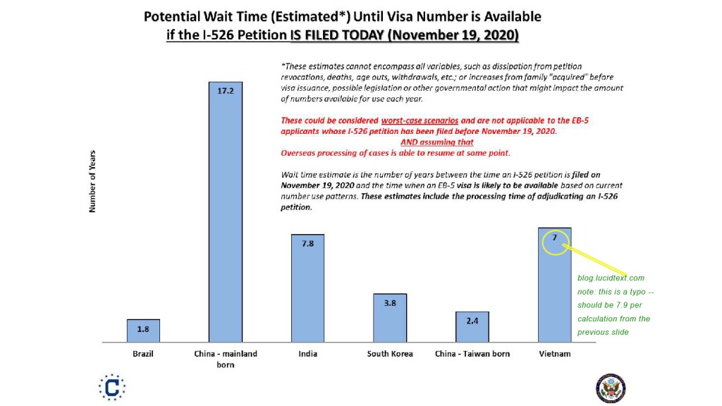 So, it’s complicated. I dream of hosting a webinar with a spreadsheet that lays out the variables and formulas, and we can play what-if games together with the numbers. What happens to the wait time estimate result if I plug in an assumed average I-526 denial rate of 70% instead of 80%? What happens if I add a  guessed 10% attrition rate at the visa stage? What if I guess 10% of children per year aging out? What if I delete the family size variable from the equation entirely in case the law changes to only count investors? What if I start from I-526 filing numbers to try to quantify those uncounted categories of people who have I-526 approval but not on file at the National Visa Center? How does the calculation change if instead of picking one average number for visa availability, I look at visa availability year-by-year into the future based on what I know about how the current backlog will spread out over time?  If I need my wait time to be a maximum five years, say, what combination/quantity of changes could yield that estimated result? (And how plausible do those changes look?)