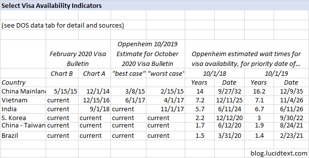 Meanwhile, India has already used “well over 500 numbers, possibly 550 or more” for FY2020 (out of 778 visas expected under the quota), partly thanks to rapid movement of the visa bulletin. Mr. Oppenheim made India current for final action in the July 2020 visa bulletin, and expects India to remain current through the end of the fiscal year. (That must mean that he does not see many India I-485 pending or forthcoming, and/or is not optimistic about the number of visa interviews that can be scheduled in India this year. If Mr. Oppenheim did foresee well over 250 Indians ready to claim a visa by September, then India would not be current for final action in the visa bulletin.)