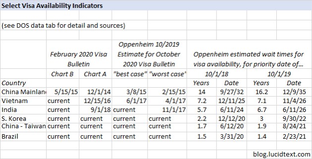 I’m still trying to think this through, considering what we’ve been previously told about backlogs. But I credit Mr. Oppenheim’s predictions, because he has much more data than we do. He clarified that USCIS and IPO report to him monthly on processing status, including how many petitions they have at various stages of processing, and how many they are working on. (Why, IPO, do you persistently refuse to provide such reports to the public, even as you claim to stand for integrity?) Meanwhile, the National Visa Center gives monthly updates on the number of applicants who have become qualified and could potentially be scheduled for interviews.
