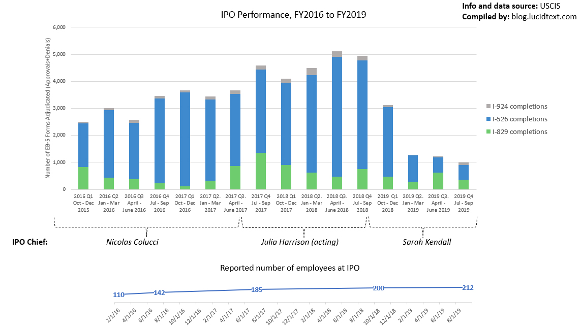 The numbers show that only China has seen a significant net increase this fiscal year in EB-5 visa applicants at NVC. Mr. Oppenheim credited this increase to IPO productivity. However, the increase could also be explained by the fact that the visa bulletin has moved to allow many more Chinese to file documents, even as the consulate has not been issuing visas. For the rest of the world, incoming visa applicants have not been sufficient even to counterbalance the few EB-5 visas issued this year. If IPO were doing its job to adjudicate petitions, we should see more visa applicants. There is a lag between I-526 approval and becoming qualified at NVC, and some approved I-526 go on to status adjustment rather than to NVC. So there’s room for hope that IPO has indeed performed well recently, and I-526 approval numbers just aren’t reflected yet in visa applicant numbers. But Mr. Oppenheim hedged about the amount of visa demand he expected to make it out of USCIS. “I’ve had to temper my expectations with the immigration service because they are under certain processing constraints.”
