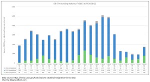 Based on the information Mr. Oppenheim provided, it appears likely that China will lose EB-5 visa numbers this year. China was expected to have over 5,000 EB-5 visas in FY2020, but in fact just over 1,000 visas were issued in Guangzhou before interviews stopped in February. Mr. Oppenheim said in the webinar that the July 2020 visa bulletin makes about 400 Chinese eligible for final action through adjustment of status, and about 3,000 Chinese eligible through consular processing. But he does not think Guangzhou could handle that many visa interviews this year even if it reopened tomorrow. (For reference, in the three years that I’ve logged monthly EB-5 visas from Guangzhou, the high was 781 visas issued in December 2017.)