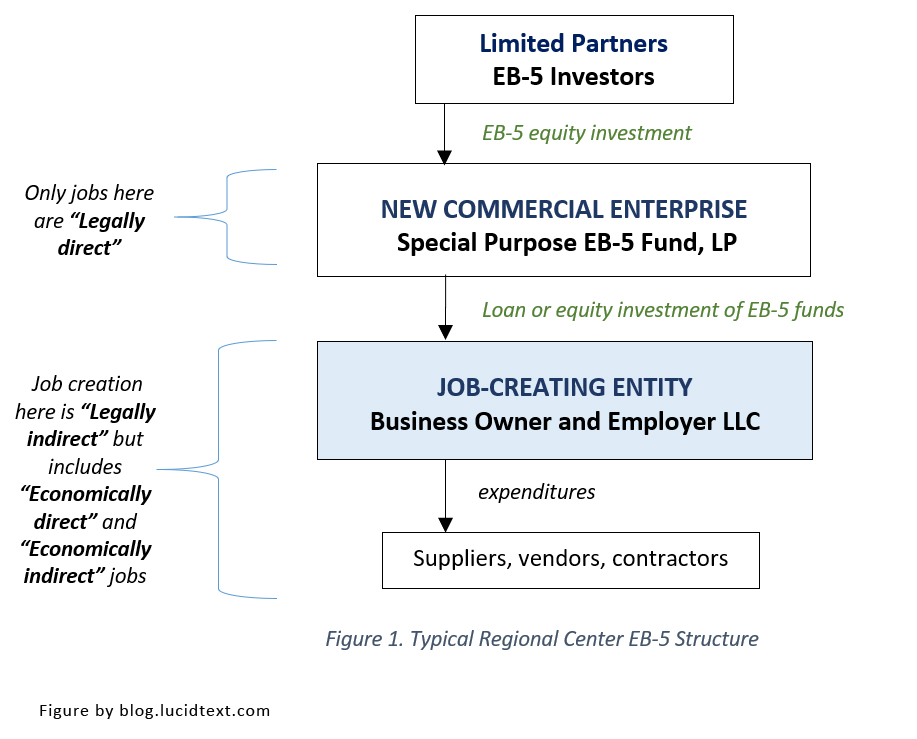 - EB-5 indirect job creation explains why regional center and direct EB-5 are not interchangeable, such that over $20 billion dollars and over 80,000 in-process EB-5 applicants currently depend on the regional center program being reauthorized into the future. Nearly 100% of regional center investments are structured with an EB-5 new commercial enterprise (NCE) that invests in a job-creating entity (JCE). That degree of separation makes all verifiable JCE direct employees and other job creation by the investment project structurally “indirect” by the EB-5 definition, and thus only countable by investors with a regional center sponsor, under the regional center program. It doesn’t matter if you can go and talk to the employees at your project, or if an economist would count direct job creation by the project. Those jobs are still “indirect” by EB-5 definition and for EB-5 purposes, except as on the payroll of the NCE. (See Point 3 below for an example from an AAO decision, discussing why an investor who lost regional center sponsorship could not go on to qualify under the direct EB-5 program.)
