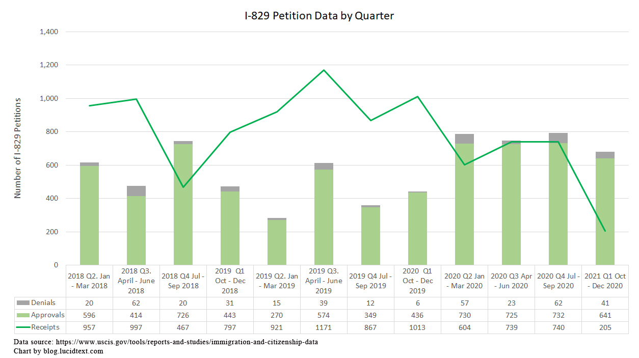 My I-829 application was delivered in November 2020 but only got receipt in Feb 2021. Maybe IPO uses “Notice Date”, rather than “Received Date” to count inventories. If my assumption is correct, we might see a significant increase of i-829 receipt in Q2 FY2021.
