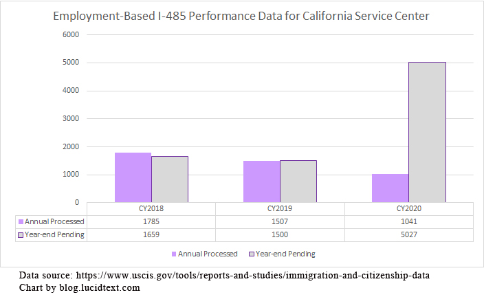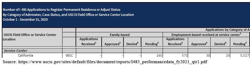 I do not usually report I-485 data because USCIS does not itemize EB-5-based I-485. The report just gives aggregate numbers for all EB category visas. However, this post highlights employment-based I-485 performance data specifically for the California Service Center, which I understand is responsible for most (all?) EB-5 I-485 decisions, and which is apparently having a meltdown. In FY2021 Q1, the California Service Center approved a record-low only 38 Employment-Based I-485 per the report (having previously averaged 300-400 EB approvals per quarter), and ended with a record-high backlog of 5,027 Employment-Based I-485 pending. Ms. Mendoza Jaddou, please hurry up and get confirmed as USCIS Director, and then find out what’s going on at the California Service Center. No one wants to see the processing times that will result if 5,000+ Employment-based I-485 continue to get processed at a rate of fewer than 100 forms per quarter. If indeed EB-5 I-485 are all ultimately forwarded to the California Service Center for adjudication, how about reconsidering that decision in light of recent performance? Too many EB-5 visas have been lost already.
