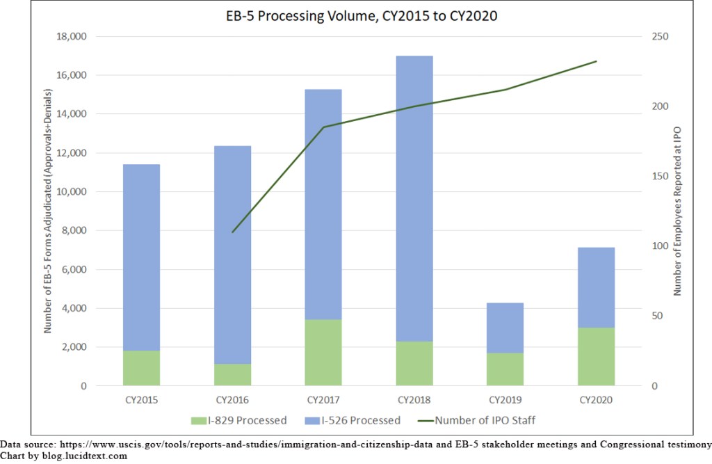 Between Q3 and Q4 2020, IPO had exhibited an encouraging 16% increase in number of forms processed (I-526 plus I-829).  Q1 FY2021 regressed again, with 7% fewer forms processed than the previous quarter. Sarah Kendall left IPO after November 2020 according to her LinkedIn page, so FY2021 Q1 represents the end of her direct influence. I warmly hope that future FY2021 reports will show the positive effect of new leadership at IPO (though Kendall still looms as USCIS Regional Director). IPO has so much room for productivity improvement, considering that they used to regularly process three times more forms with fewer staff than they have today.