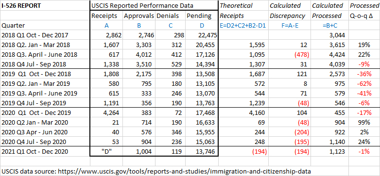 The I-526 data reported for FY2021 Q1 shows that USCIS struggles to count inventory, even after taking over three months to generate the report.