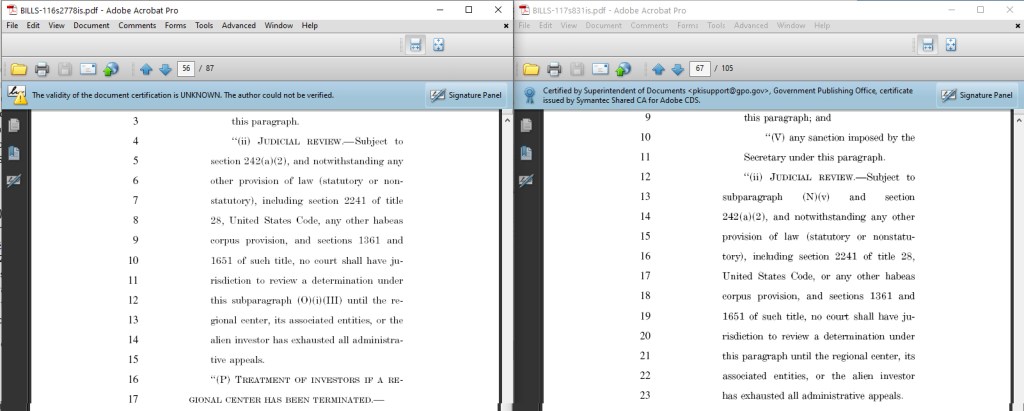 One significant difference is the account transparency/fund administration provision, which S.831 has and S.2778 did not. Fund administration and account transparency are powerful integrity measures from an investor and public policy perspective (directly addressing a common denominator in past problem deals), and also a significant hassle and expense for regional centers. Would an alternative bill with no fund admin/account transparency requirement be better, more likely to gain support, and worth holding out for? What about the requirement for regional center to make annual statements filed with USCIS also available to investors (a provision in S.831 and not S.2778)? That makes sense, right? How serious would integrity measures look, if they only involve making records available to opaque and sluggish USCIS?