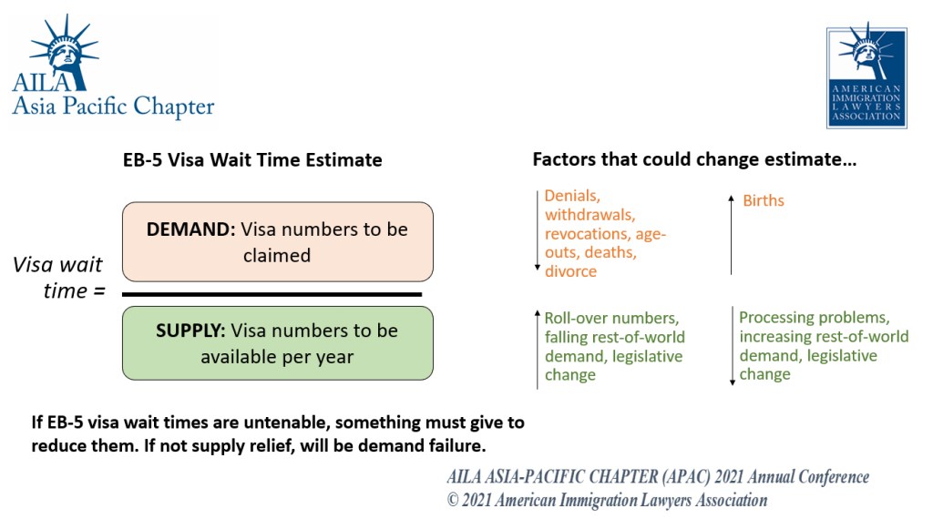 I’ll close with a chart summarizing the current state of the EB-5 backlog (with and without derivatives), and with a slide that I made earlier this year for an AILA conference. The backlog chart reiterates how much good would result if Congress clarified that the @10,000 EB-5 visa quota applies specifically to EB-5 investors (principal applicants). The slide reflects an insight that came to me as I struggled to think through realistic EB-5 wait time predictions. “If EB-5 visa wait times are untenable, then something must give to reduce them. If not supply relief, will be demand failure.” If only legislative change can put us on the path of positive relief, and a sustainable and productive future. If that’s not possible today, let’s at least do what it takes to get reauthorization and protection for past regional center investment as soon as possible, to protect the possibility for future relief,