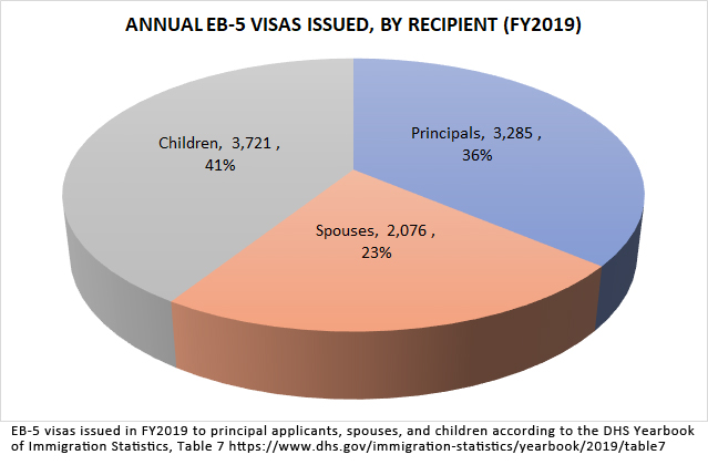 First, let’s look at who uses EB-5 visas. EB-5 gets just 7.1% of total employment-based visas, or about 10,000 visas per year. Lawmakers may assume that by making about 10,000 EB-5 visas available, they have incentivized about 10,000 EB-5 investments annually. That’s not the case.  In FY2019, minor children received 41% of EB-5 visas issued, while just 36% of the quota went to EB-5 investor principals. In previous years, spouses and children received an even larger percentage of EB-5 visas. So long as the EB-5 quota must be shared between principals and their families, it can sustainably incentivize fewer than 4,000 investments annually. More investors do not fit within visa availability.