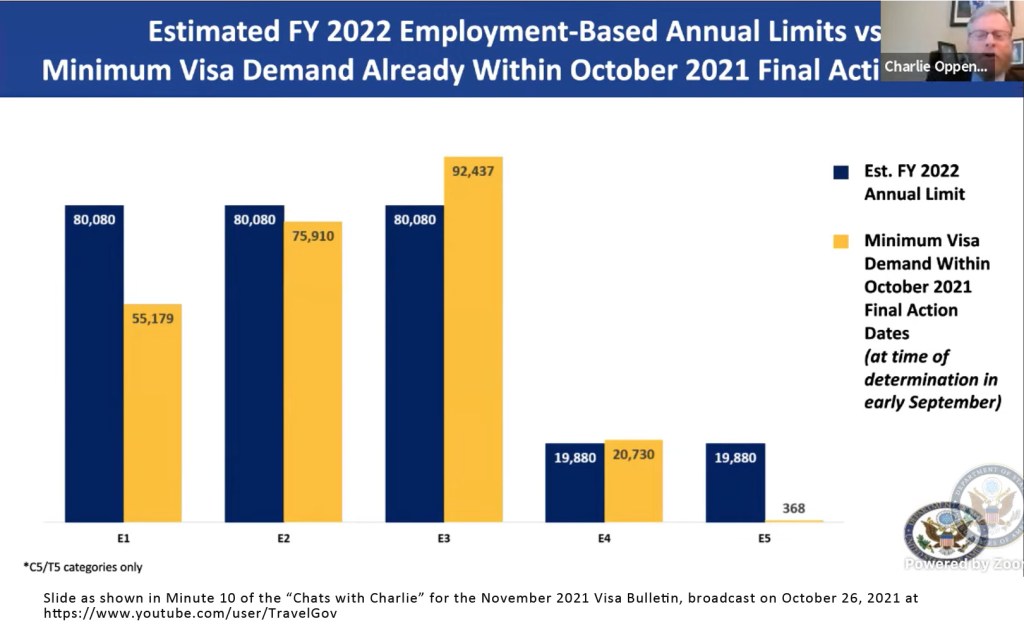 As the chart shows, the E5 (EB-5) category has a record 19,880 visas available this year (even higher than the 18,602 previously anticipated), and so far only about 368 applicants eligible to claim them. Those 368 applicants represent the inventory of direct EB-5 (C5 and T5) applicants at the visa stage as of September 2021, except for China-born applicants with priority dates more recent than November 22, 2015 (the China final action date in the October 2021 visa bulletin).