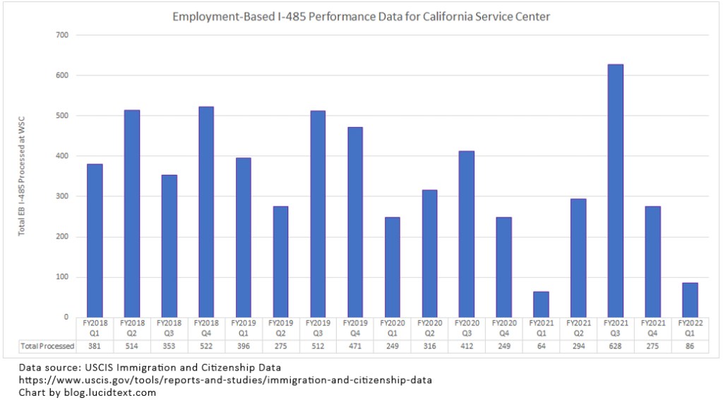 While USCIS does not report data specific to EB-5 I-485, I always check the category-wide I-485 report and look at performance numbers for the California Service Center, where most (all?) EB-5 I-485 get adjudicated. California Service Center productivity unfortunately also does not look good for the inventory of 5,400 Employment-Based forms. (I don’t know what fraction of the EB inventory is EB-5.)