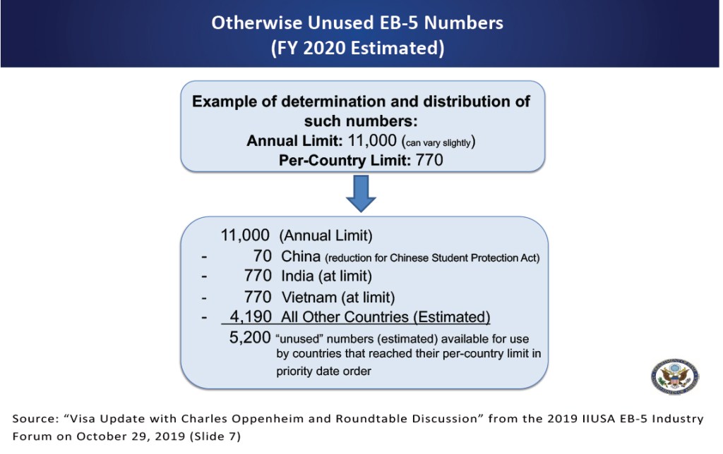 For a reminder of how EB-5 visa distribution used to work, consider this slide from the “Visa Update with Charles Oppenheim and Roundtable Discussion” at the 2019 IIUSA EB-5 Industry Forum (October 29, 2019). The equation starts with the annual visa limit, then deducts all qualified demand from applicants at/under the per-country limit, and ends with a difference of “unused” numbers available for allocation to the oldest applicants regardless of per-country limit.