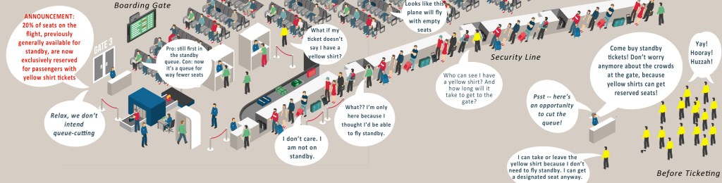 In the picture, I tried to illustrate who’s happy (the ticket seller), who’s sad (the displaced standby passengers at the gate), who’s confused (the pending standby passengers who technically match reserve conditions, but not sure yet how/if they can claim new codes only being stamped outside on new tickets), who doesn’t care (the passenger who has a designated seat anyway and not dependent on standby or reserves), who’s frustrated (the guy at the gate who looks around, sees no one positioned yet to use up the reserved seats, and realizes that planes will have to take off partly empty until new reserve-eligible passengers finally make it to the gate, meaning existing standbys get further delayed for nothing), who’s conflicted (the prospective passengers standing in a crowd outside the ticket counter, wondering how to interpret the pitch that they won’t find themselves stuck in a crowd once they get to the boarding gate), and who’s two-faced (the airline, with different messages at the ticket counter and the gate).