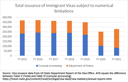 - Visa issuance data from US State Department Report of the Visa Office. Adjustment of status equals the difference between Table V (Total) and Table VI (consular processing)