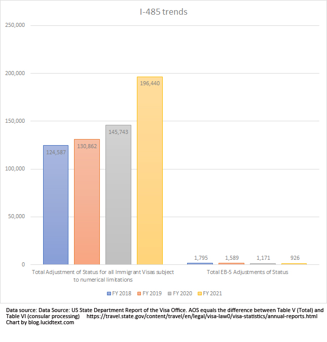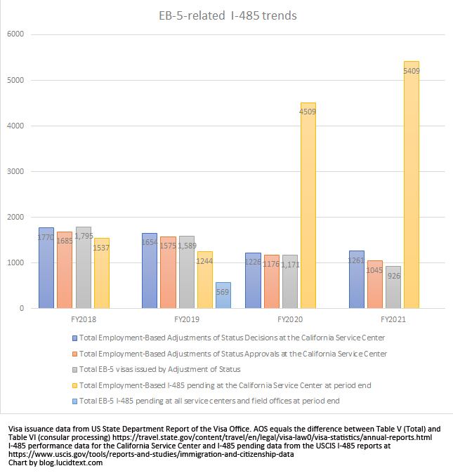 - While a relatively high in terms of percentage, Adjustment of Status EB-5 visas were still a very low number in FY2021 – the lowest in five years. Generally, USCIS boasted of its efforts in FY2021 to ramp up I-485 processing volume to help compensate for consular closures and prevent visa loss. Data shows that employment-based I-485 completions increased across the board in FY2021 — except sadly not at the California Service Center, and not for EB-5 status adjustments. AOS visas between FY2020 and FY2021 increased 35% overall, but fell 21% for EB-5. See the base of the post for additional charts illustrating I-485 trends. The regional center program expiration must be partly to blame for abnormally low AOS EB-5 visa numbers last year. Trend charts also show I-485 processing issues that predate the regional center program expiration, and even the pandemic. If you have a pending or future I-485, consider these charts and what has to change.