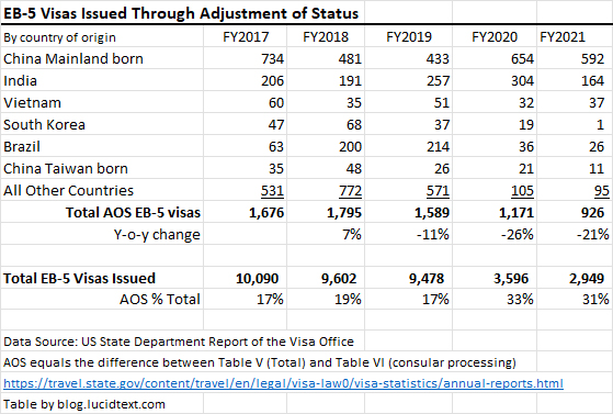 - A relatively high percentage of EB-5 visas in FY2021 were issued through Adjustment of Status — not because 31% of EB-5 demand is living in the U.S., but because COVID-19 shut down consular processing abroad more than I-485 processing in the U.S. (For the on-going pandemic impact on consular processing, see the NVC Immigrant Visa Backlog Report page.)