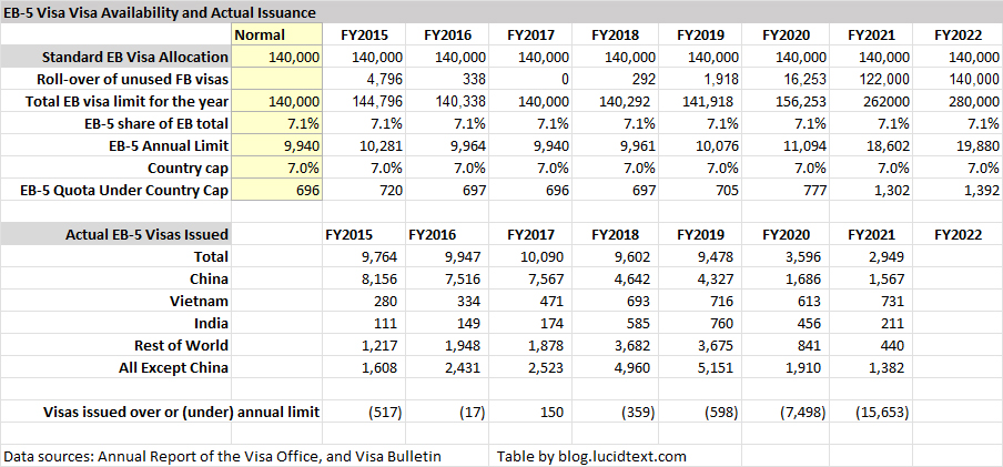 FY2021 EB-5 visas issued by country, and analysis of constraints on visa issuance