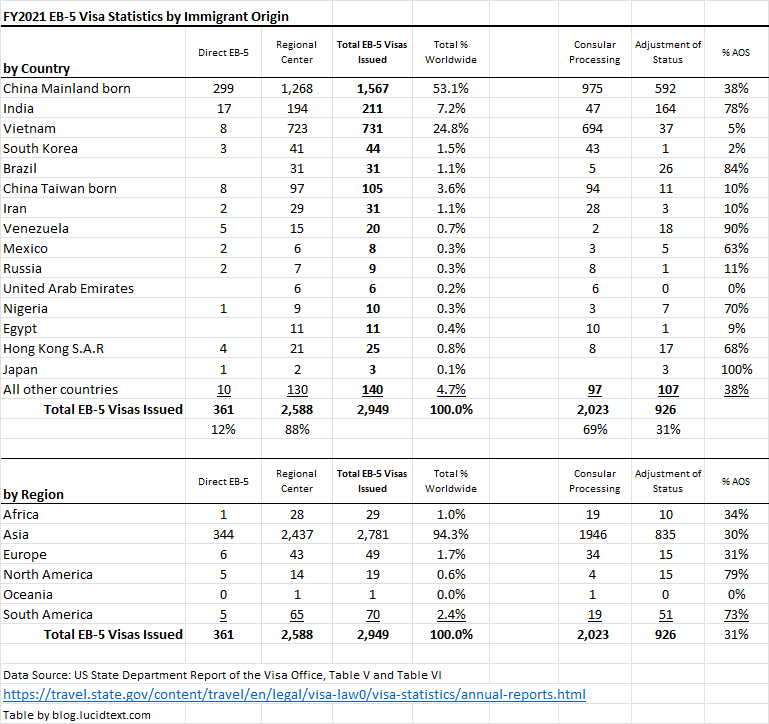 Department of State has published the Report of the Visa Office 2021, including data for the number of EB-5 visas issued by country through consular processing and adjustment of status from October 2020 through September 2021. The following three tables summarize key data points for traditionally high-volume countries.