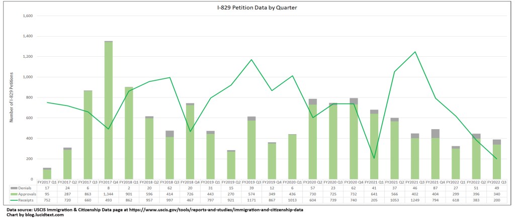 • Over the past year, I-829 processing has generally clustered around petitions filed in 2019, but also included many I-829 filed in 2017 and 2018, and a few filed as early as 2015 and as late as 2021. I do not know the reasons for departing from FIFO discipline in I-829 adjudications. Is there an element of randomness in case assignment resulting from paper files and lax management? Is USCIS trying to group I-829 from different filing dates by project, to process the project all at once? Are expedite approvals and mandamus actions having a significant impact? Are certain groups of I-829 intentionally left untouched or taking years of touch time for reasons related to policy or litigation? If anyone would like to leak reasons to me, please reach out on email, phone, or Telegram.
