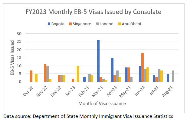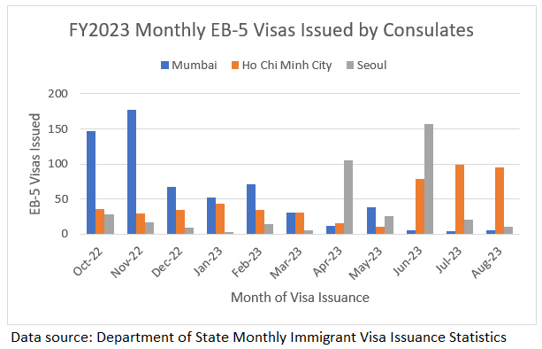 Applicants from Hong Kong received fewer than 100 EB-5 visas in 2023 even though over 600 Hong Kong EB-5 applicants were registered and waiting at NVC. What’s the excuse? Why did Ho Chi Minh City issue only 527 EB-5 visas in the first 11 months of 2023, although the year started with over 1,500 Vietnamese registered at NVC (and no country cap limit for Vietnam this year per the Visa Bulletin)? Why do the monthly visa issuance statistics show that many consulates only got going with EB-5 interviews near the end of the year, instead of working consistently throughout the year as they’re supposed to do (or instead of working aggressively at the beginning of the year, as Mumbai did)? In particular, consulates in Seoul, Montreal, Rio de Janeiro, and Bogota did little EB-5 work the start of 2023. Let’s not repeat this pattern in 2024.