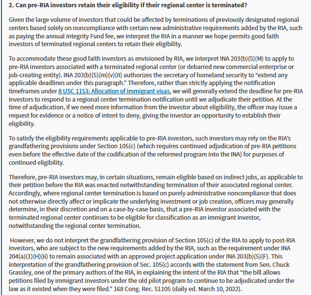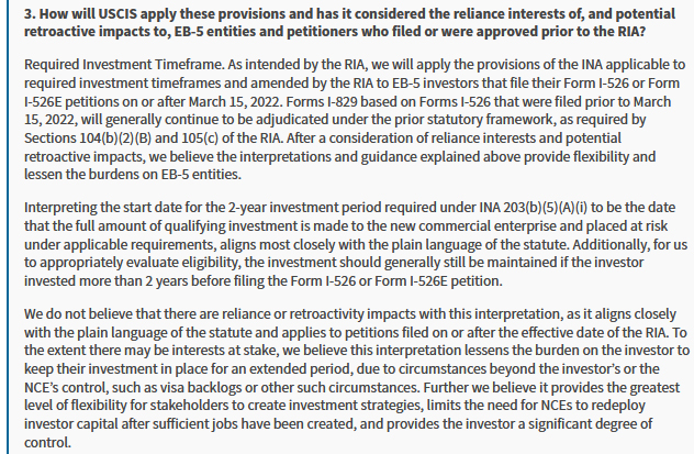 • Note that this Q&A is particularly focused on interpreting the RIA. There are still open questions around redeployment generally, including for pre-RIA investors, and still regulations to be written. The case is not closed yet, and people continue to advocate on this topic. See for example https://goaiia.org/the-nightmare-that-is-eb5-redeployment/