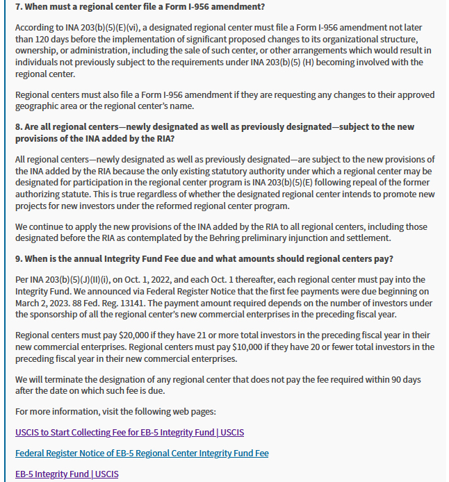 Today USCIS published a page of EB-5 Questions and Answers (updated Oct. 2023), with the most extensive guidance to date on USCIS interpretation of the EB-5 Reform and Integrity Act. For historical reference, here are images as the Q&A posted on October 11, 2023, in case the content is subsequently challenged and revised.