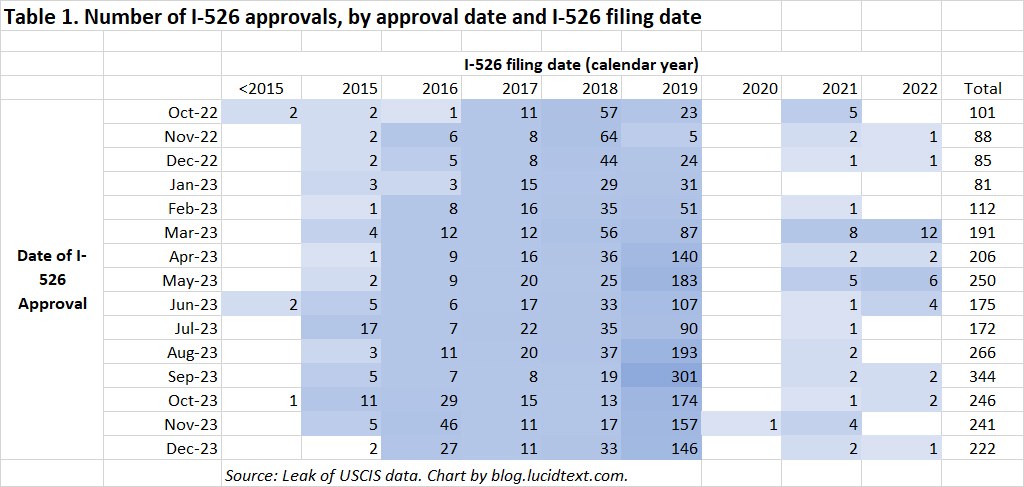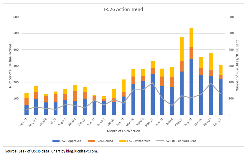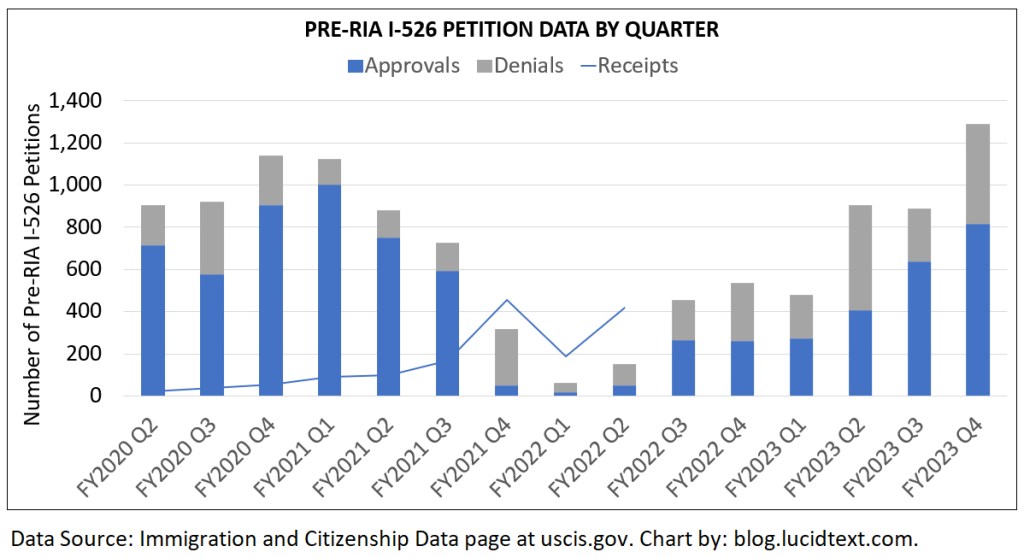 Answer from Q4 data: The linear upward trend continued, for a cumulative total of over 2,600 post-RIA I-526 and I-526E filed as of September 30, 2023. (The figure could be nearly 3,000 if one sums quarterly receipt numbers instead of believing the period-end pending and processed numbers.)