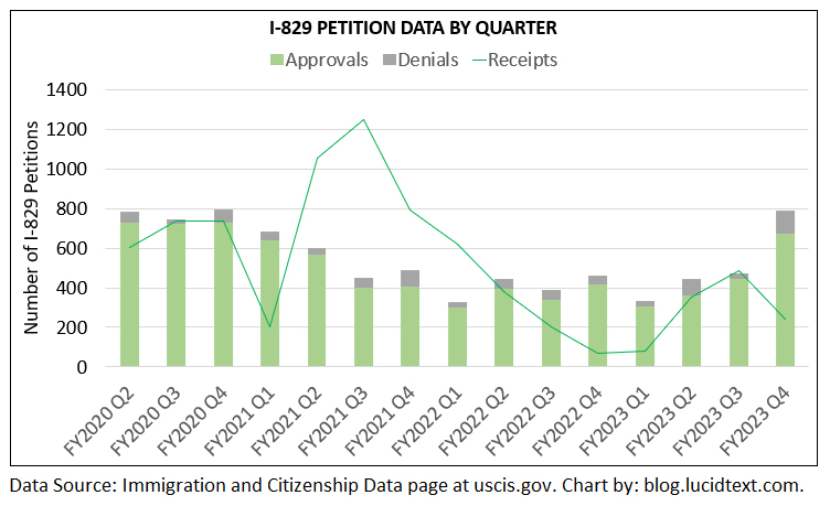 I-829 denial rates have consistently neared or exceeded 10% since mid 2021; correlated with the new USCIS trend of re-adjudicating previously-approved source of funds at the I-829 stage. (Project problems could be a factor too, but I don’t know of specifics.) The FY2023 Q4 denial number is relatively high partly just because total completions were — thankfully — relatively high; the Q4 denial percentage (15%) is not unusually high.