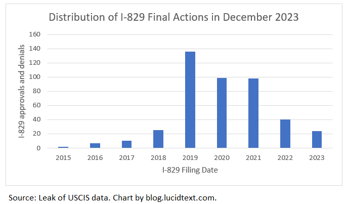 People at the back of the inventory for I-526 and I-829 processing need not necessarily despair about their processing times, however, because processing is not close to FIFO. I know from other sources that USCIS has recently primarily been processing I-526 filed in November 2019 – nearly the end of the I-526 queue – and has been approving many I-829 filed in 2020, 2021, 2022, and even 2023, even as the median I-829 processing time reflects cases filed in 2019. See the charts below and on my regularly-updated Processing Data page the processing distribution of recent I-526 and I-829 approvals.